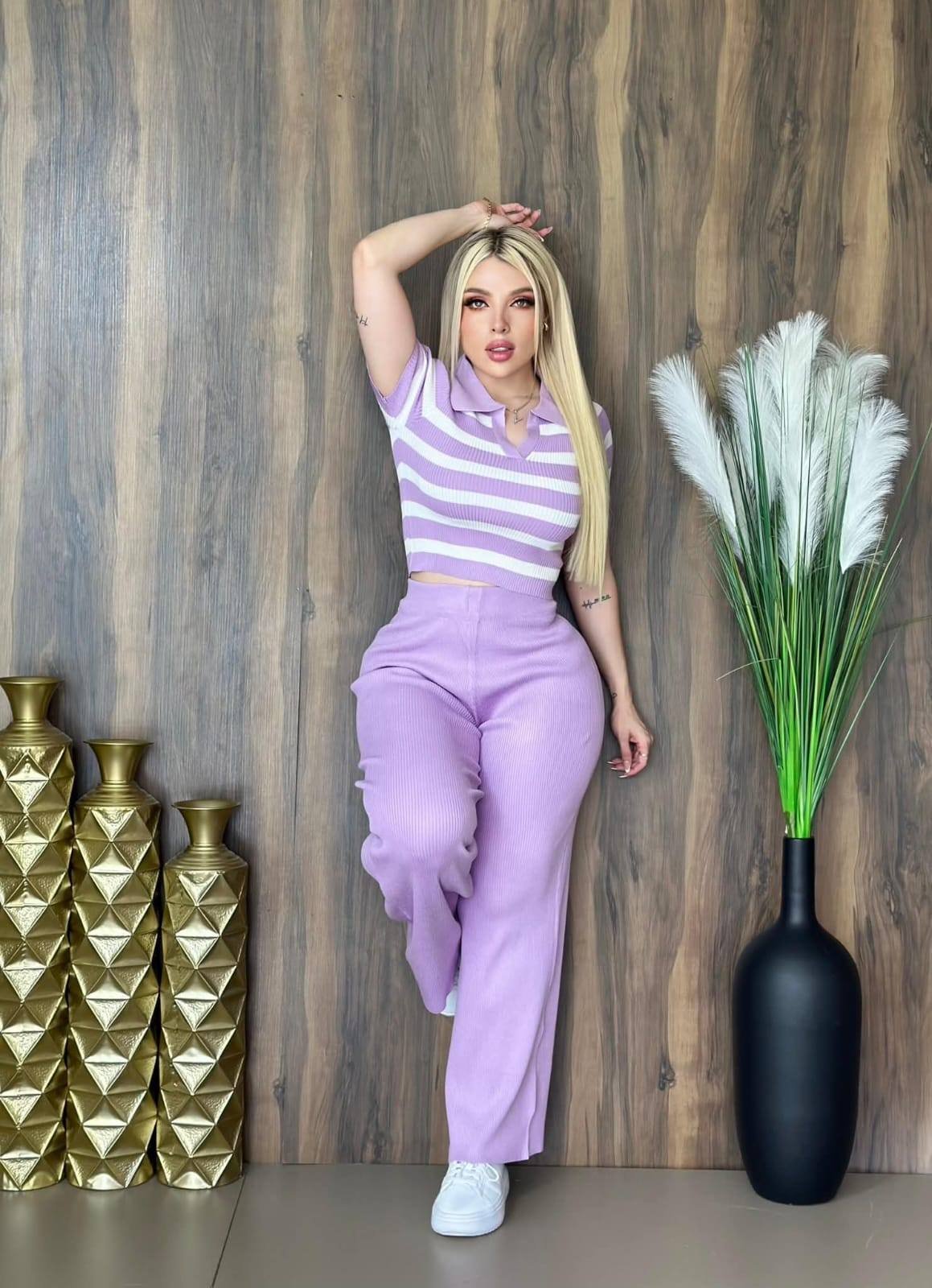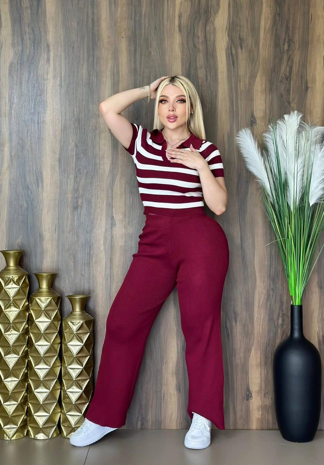 Incluye pantalón amplio y blusa a rayas súper chic.